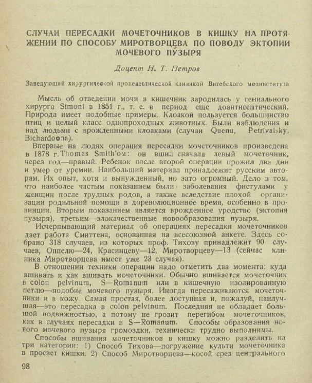 12. Петров, Н. Т. Случаи пересадки мочеточников в кишку на протяжении по способу Миротворцева по поводу эктопии мочевого пузыря / Н. Т. Петров // Медицинский журнал БССР. – № 5–6. – С. 98–100.