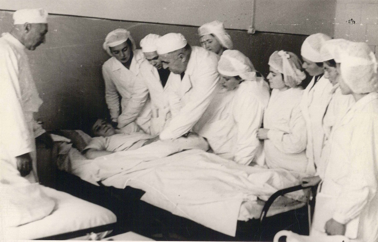 Проф. Н. Т. Петров во время осмотра больного в палате 2-й советской больницы. Присутствуют студенты-практиканты МГМИ. Минск, октябрь 1947 г. Фонды Музея истории медицины Беларуси.