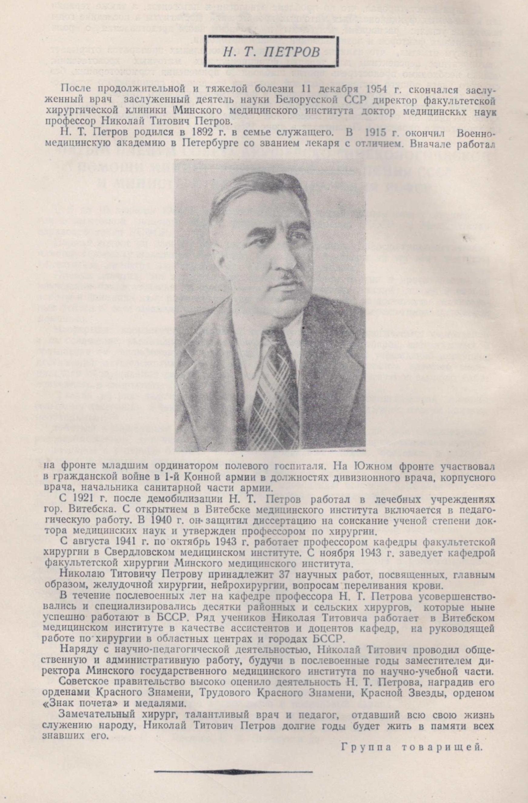 Некролог посвященный Н. Т. Петрову и опубликованный в в 1955 г. в №1 журнала «Здравоохранение Белоруссии» Фонды Музея истории медицины Беларуси.
