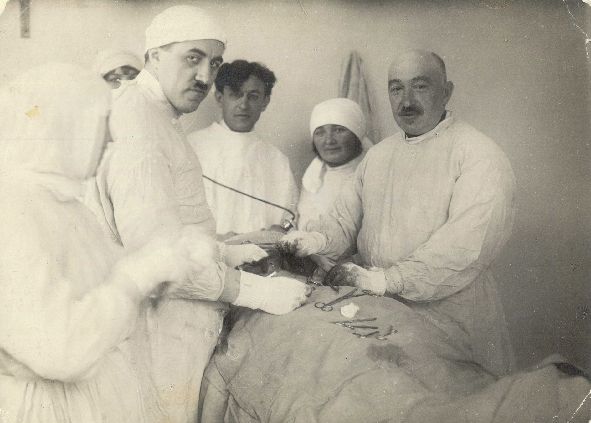 В операционной больницы им. Калинина. Слева направо: Н. Т. Петров, Гусинский, Г. Н. Величко. Витебск. 1925–1930 гг. Фонды Музея истории медицины Беларуси.