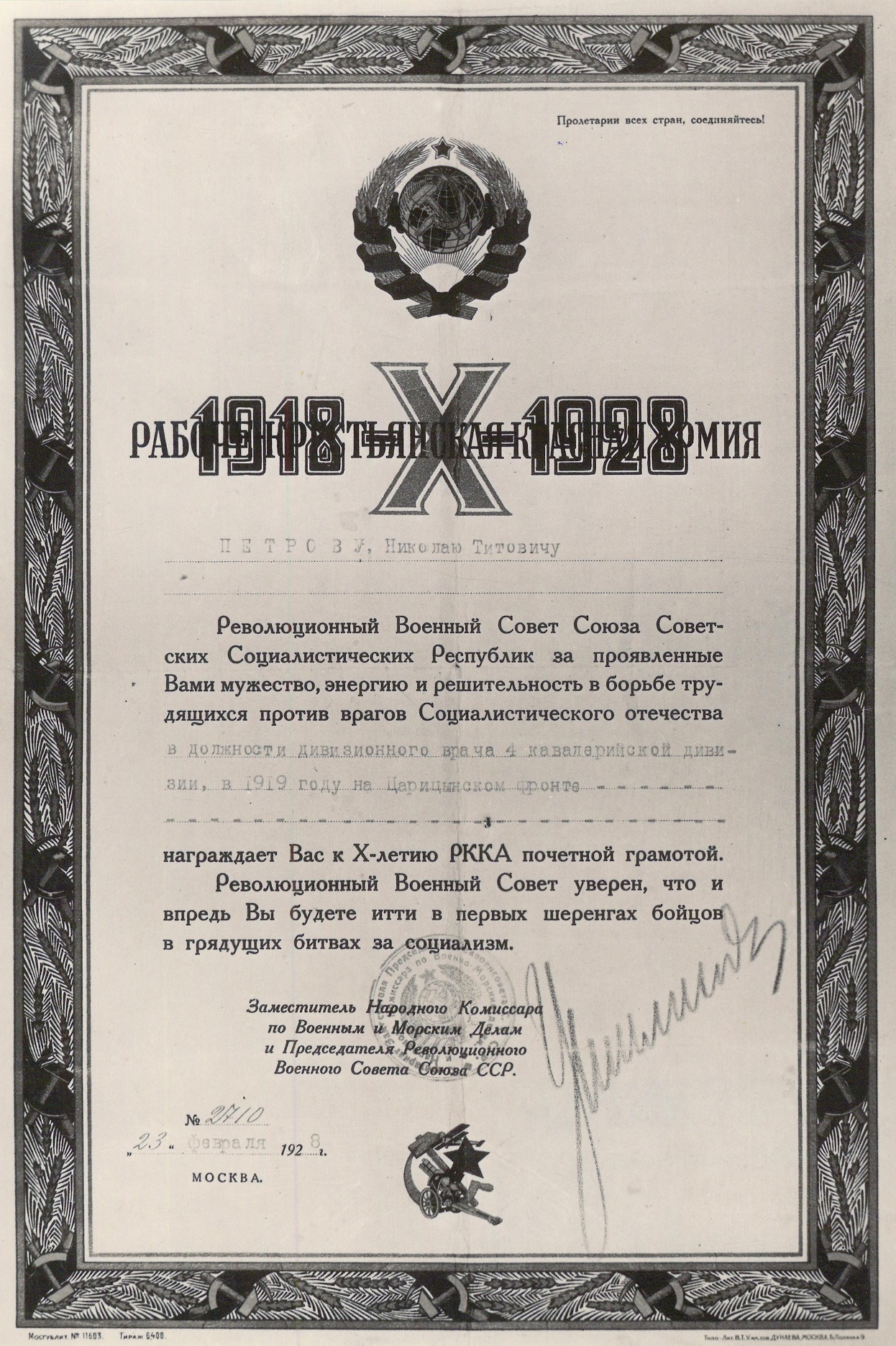 Известный советский полководец, участник гражданской войны Семен Михайлович Буденный (1883–1973) в своих воспоминаниях «Пройденный путь» дал такую характеристику Н. Т. Петрову: «Санитарную службу бригады возглавил замечательный хирург Петров. В нем сочетались качества искусного специалиста – медика и храброго бойца» [2, с. 89]. С. М. Буденный упоминал о непростой и напряженной деятельности врачей и среднего медицинского персонала, служивших в его Первой Конной армии: «Каждому медработнику Конармии приходилось работать за троих. Начальник санслужбы армии Д. К. Дедов-Назрицкий, врачи Петров, Данилов, Рейтлингер, Сербинов, Французов, Очкин, Шмидт, Ишлонский, Гейнали, Ванеев, Гальперин, Желиковский, Мацкевич, Легов, Капланов и многие другие сбивались с ног. Трудно подобрать слова, в полной мере характеризующие героический труд наших врачей, фельдшеров, медицинских сестер, санитаров. Их работа была непрерывным подвигом. И все же им не хватало времени, чтобы оказать помощь всем пострадавшим. Кончался один обход, начинался другой. И зачастую так продолжалось до тех пор, пока врач не выбивался из сил или сам не заболевал» [3, с. 350]. В числе заболевших врачей армии С. М. Буденного оказался и Николай Титович Петров. После перенесенного сыпного и возвратного тифа он был признан годным к службе в тылу и назначен начальником 674-го полевого запасного госпиталя [10, с. 4]. В фондах Музея истории медицины Беларуси хранятся копии грамот, врученных Н. Т. Петрову к юбилейным датам создания Красной Армии, а также копия телеграммы, в которой С. М. Буденный поздравлял Н. Т. Петрова: «сердечно поздравляю Вас с 30-й годовщиной Советской Армии желаю Вам здоровья и успехов в Вашей плодотворной работе» [8].