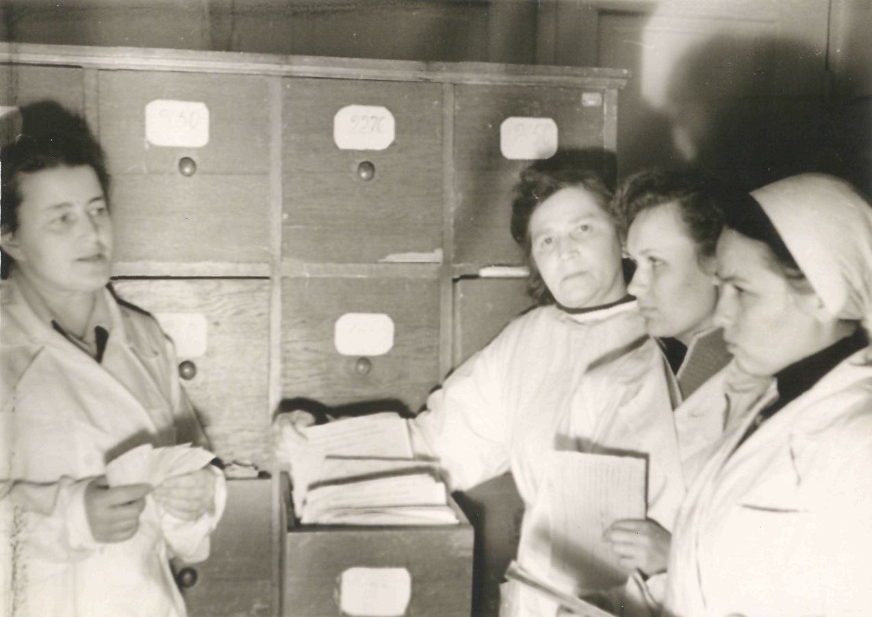 Е. Г. Бреус (1-я слева) во время проведения практических занятий по организации здравоохранения в психиатрическом диспансере. Минск, 1958 г. Из фондов Музея истории медицины Беларуси.