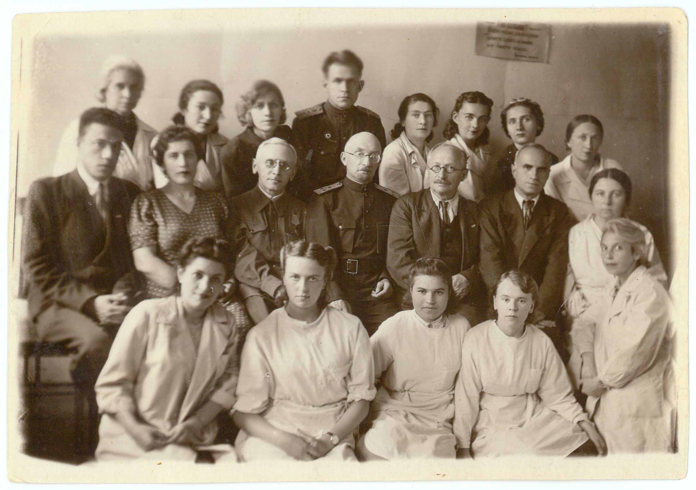 Коллектив врачей эвакогоспиталя № 5775 с сотрудниками Белорусского медицинского института в Ярославле. Во 2-м ряду слева направо: 1-й – анатом, член-кореспондент АН БССР, доктор медицинских наук, профессор Д.М. Голуб, 3-й – невропатолог, доктор медицинских наук, профессор М.А. Хазанов, 5-й – хирург, заслуженный деятель науки БССР, доктор медицинских наук, профессор Е.В. Корчиц Е.В., 6-й – психиатр, доктор медицинских наук, профессор В.И. Аккерман. Ярославль, 1944 г.