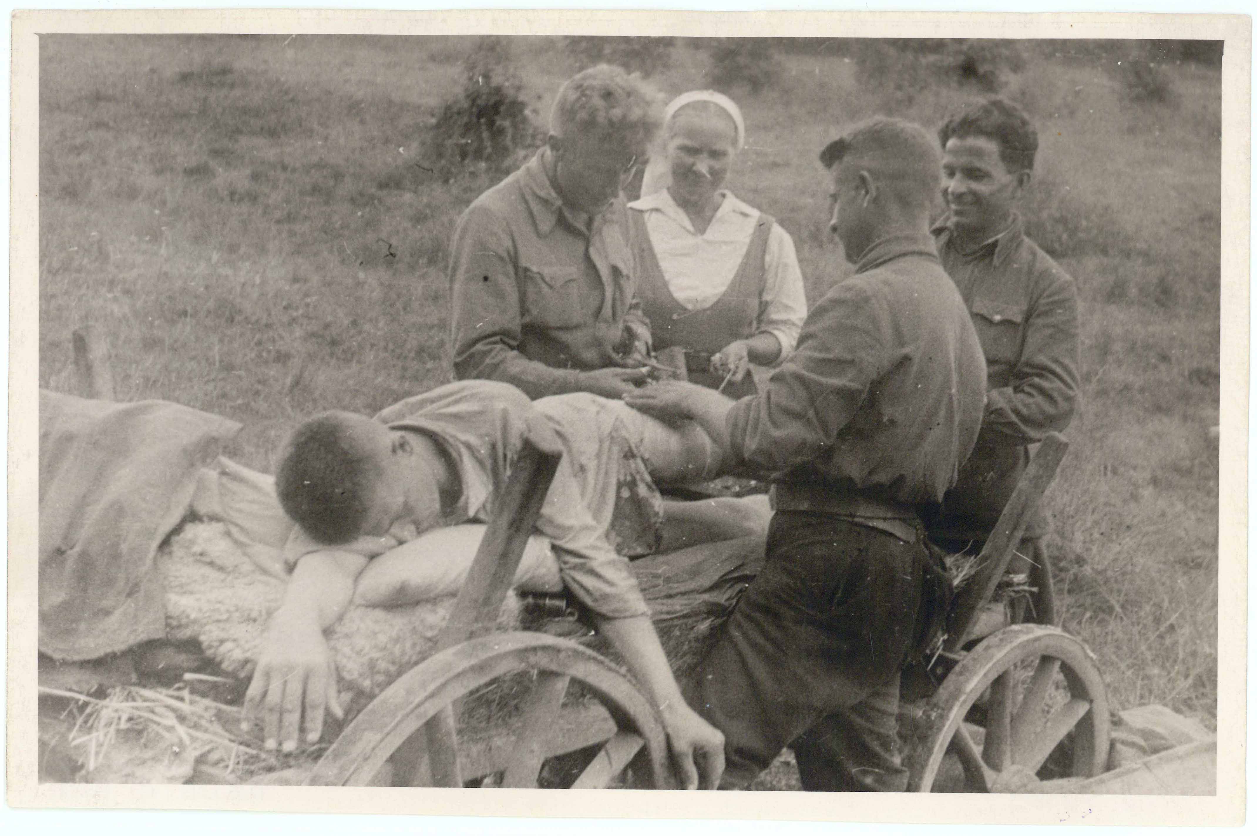Врачи бригады “Буревестник” Минского партизанского соединения Сиволобцев и Разуваев оперируют раненого партизана. Июнь 1944г.