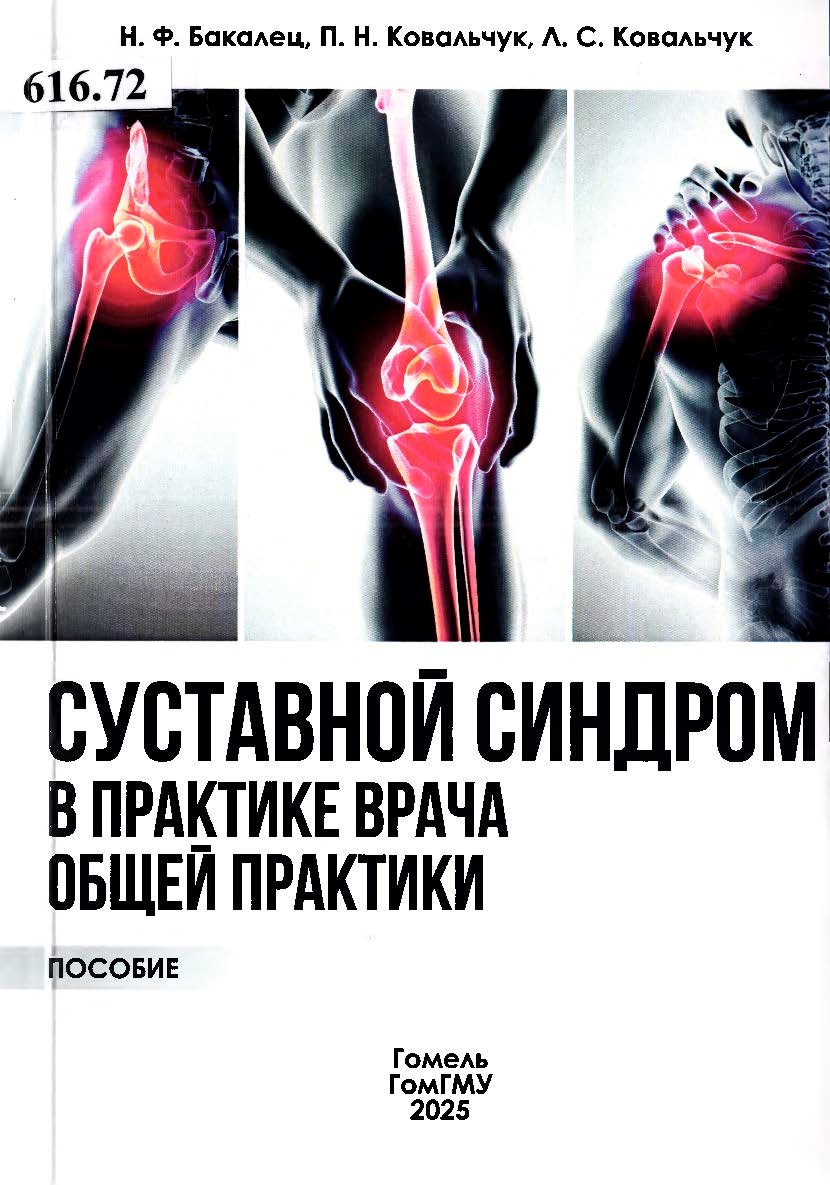 Бакалец, Н. Ф. Суставной синдром в практике врача общей практики : пособие для студентов учреждений высш. образования, обучающихся по специальности «Лечеб. дело» / Н. Ф. Бакалец, П. Н. Ковальчук, Л. С. Ковальчук ; Министерство здравоохранения Республики Беларусь, Гомельский государственный медицинский университет. – Гомель : ГомГМУ, 2025. – 123 с.