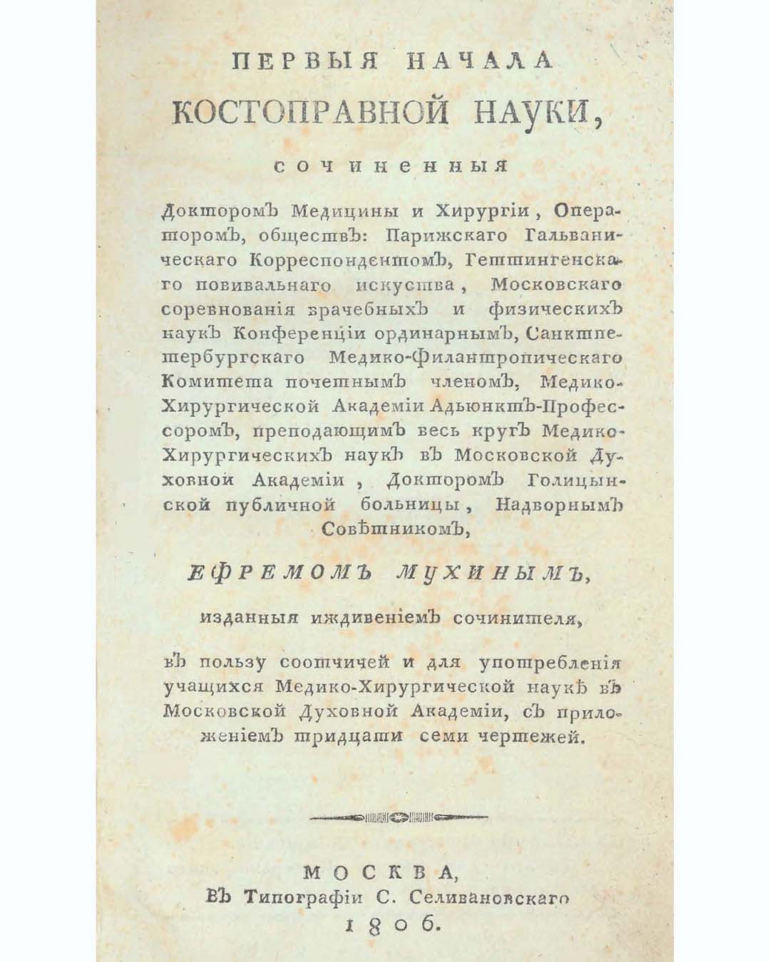 В фондах Республиканской научной медицинской библиотеки хранятся первая и вторая книги фундаментального труда Ефрема Осиповича Мухина «Первые начала костоправной науки», напечатанного 220 лет назад и ставшего первым оригинальным учебником по травматологии и ортопедии на русском языке. Издание заложило фундамент русской школы травматологии. «Наука сия хоть и существовала прежде, но в раздельном виде. Костоправы, занимавшиеся сим делом, не имели по сие время никакого особенного для себя наставления», – писал автор в предисловии. Многие принципы, описанные Мухиным, например, необходимость обезболивания, хотя бы простейшего на тот момент, и важность ранней реабилитации, опередили свое время.