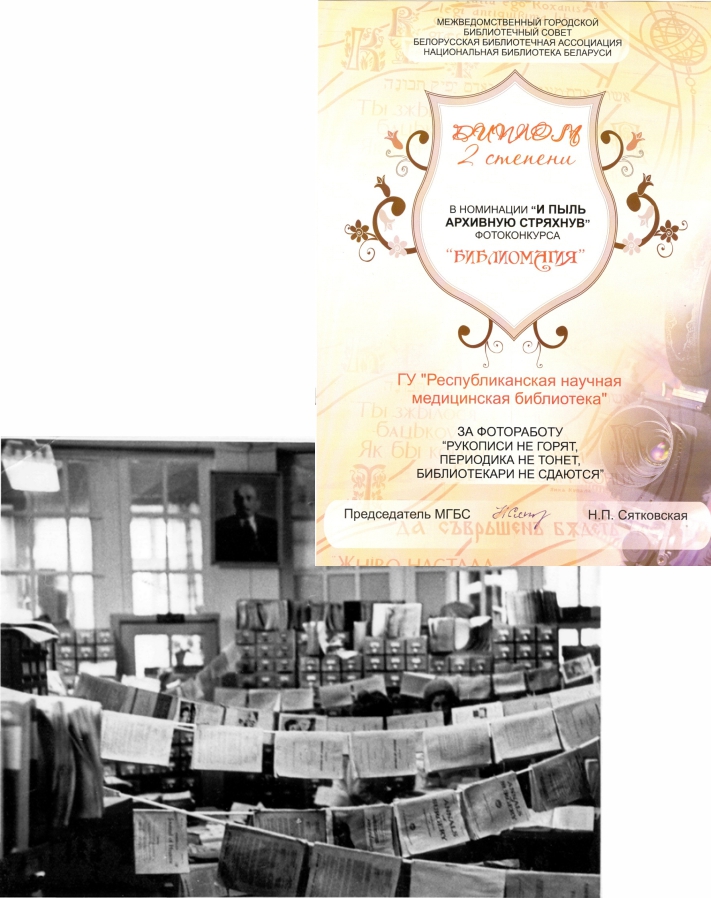 Наши многогранные библиотекари проявляли себя и с творческой стороны. Так, в республиканском фотоконкурсе «Библиомагия» работа РНМБ с говорящим названием «Рукописи не горят, периодика не тонет, библиотекари не сдаются» получила диплом II степени.