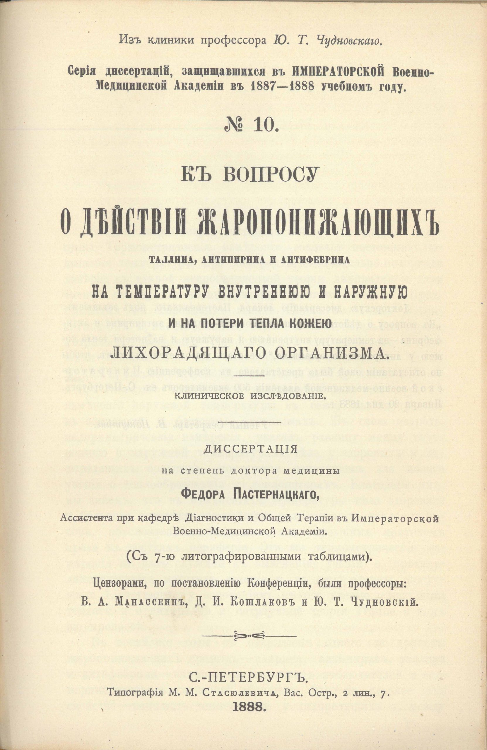 Титульный лист диссертации на степень доктора медицины Ф. И. Пастернацкого «О действии жаропонижающих таллина, антипирина и антифебрина на внутреннюю и наружную температуру и на потерю тепла кожею лихорадящего организма». Санкт-Петербург, 1888 г. Фонды Республиканской научной медицинской библиотеки.