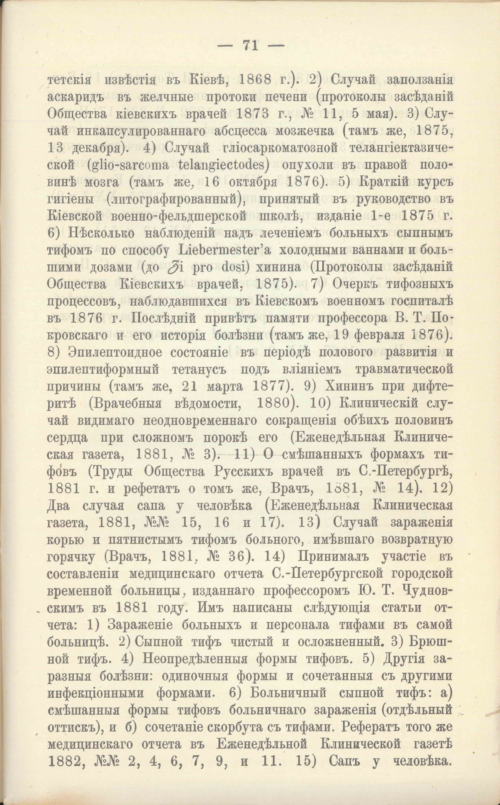 Список печатных трудов Ф. И. Пастернацком из его диссертации на степень доктора медицины. Фонды Республиканской научной медицинской библиотеки.