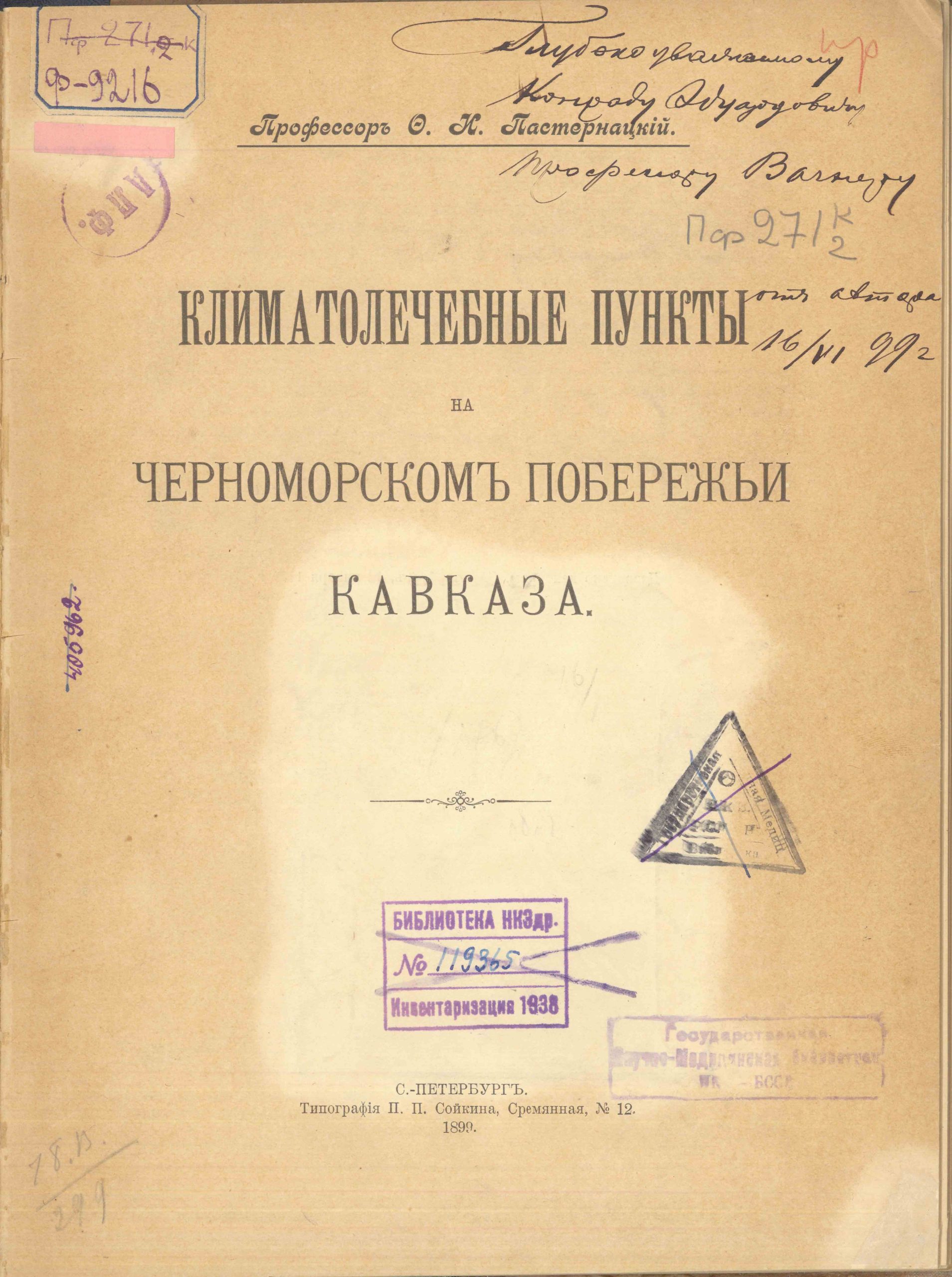 Ф. И. Пастернацкий «Климатологические пункты на Черноморском побережье Кавказа». Санкт-Петербург, 1892 г. С дарственной надписью Ф. И. Пастернацкого: «Глубокоуважаемому Конраду Эдуардовичу профессору Вагнеру от автора 16/VI 99 г.». Фонды Республиканской научной медицинской библиотеки.