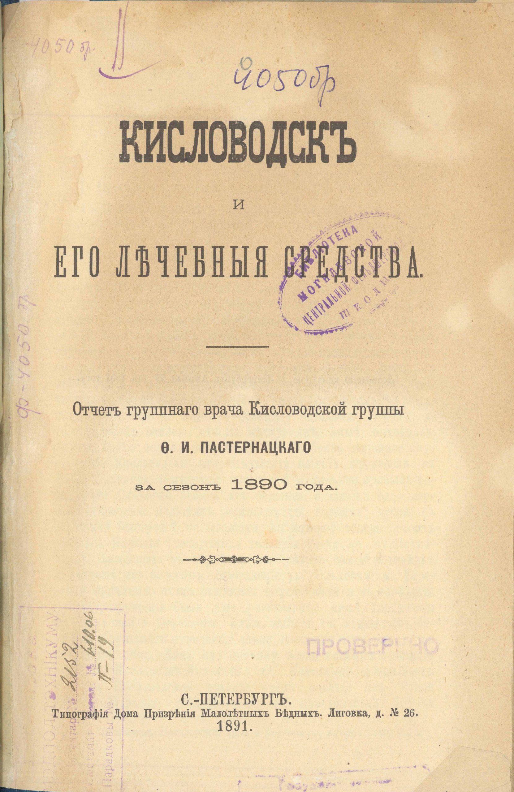 Ф. И. Пастернацкий «Кисловодск и его лечебные средства. Отчет группного врача Кисловодской группы Ф. И. Пастернацкого за сезон 1890 года». Санкт-Петербург, 1891 г. Фонды Республиканской научной медицинской библиотеки.