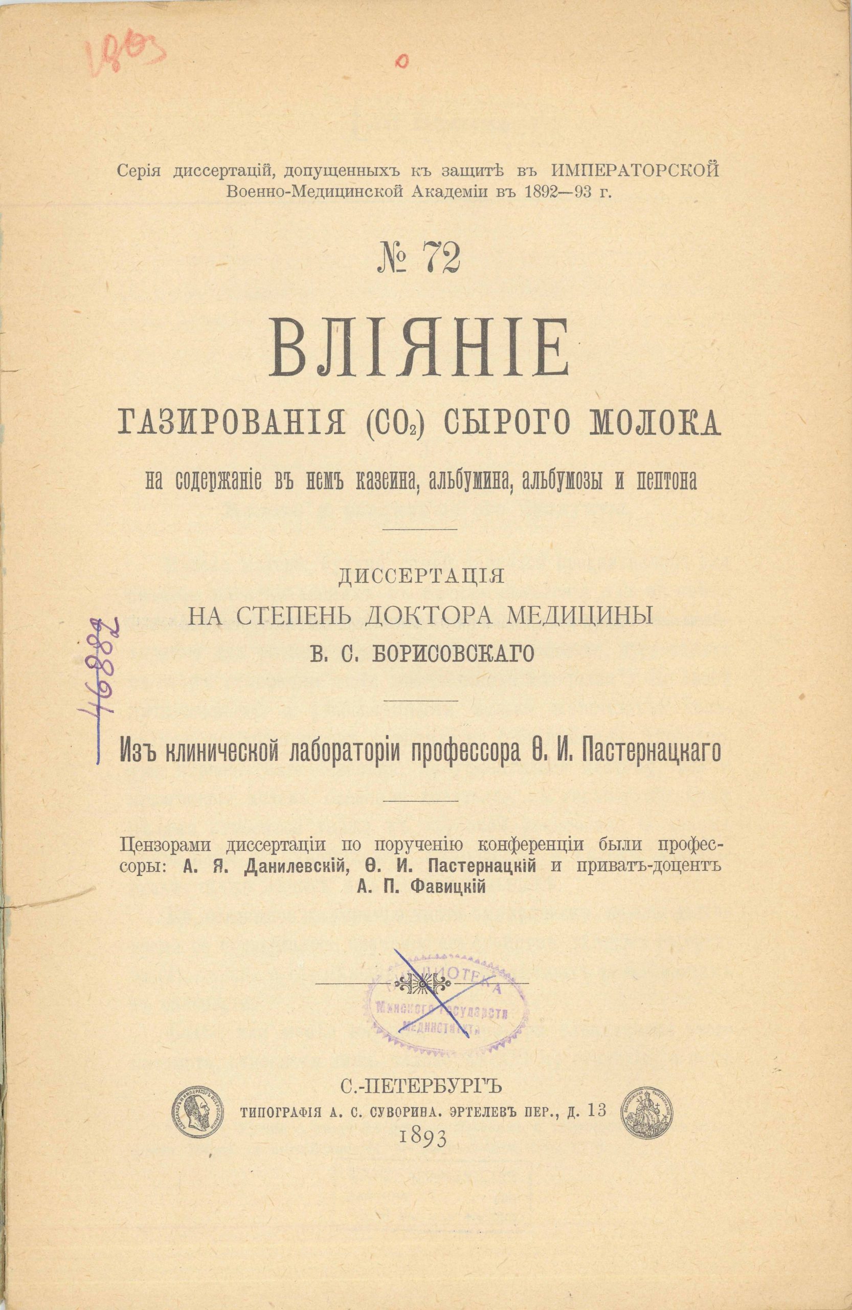 Диссертация на степень доктора медицины Владимира Савича Борисовского «Влияние газирования (CO2) сырого молока на содержание в нем казеина, альбумина и пептона». Из клинической лаборатории Ф. И. Пастернацкого. Санкт-Петербург, 1893 г. Фонды Республиканской научной медицинской библиотеки.