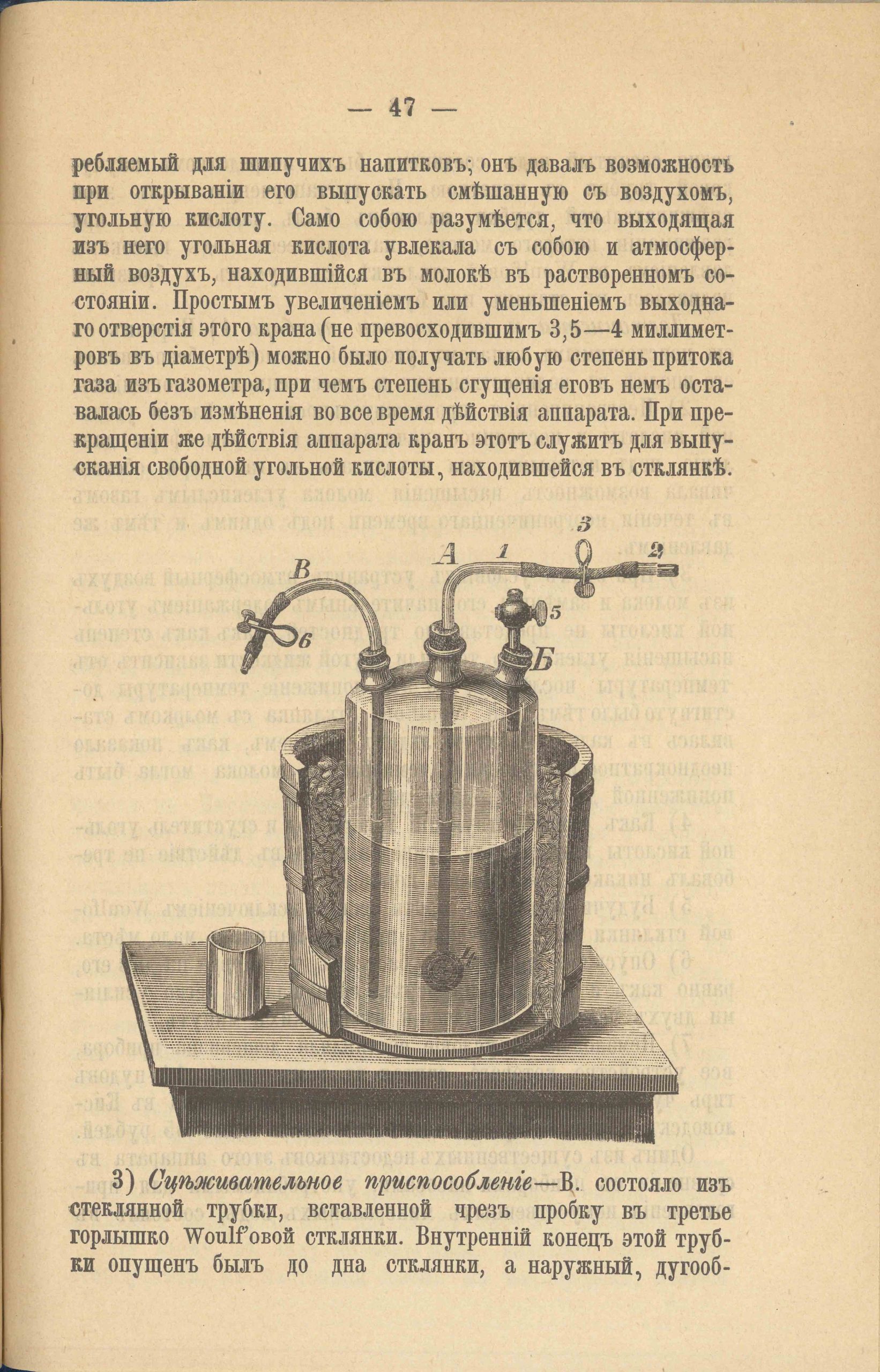Иллюстрация приспособления для газированного молока в большом количестве, предложенное Ф. И. Пастернацким и опубликованное им в издании «Кисловодск и его лечебные средства. Отчет группного врача Кисловодской группы Ф. И. Пастернацкого за сезон 1890 года». Фонды Республиканской научной медицинской библиотеки.