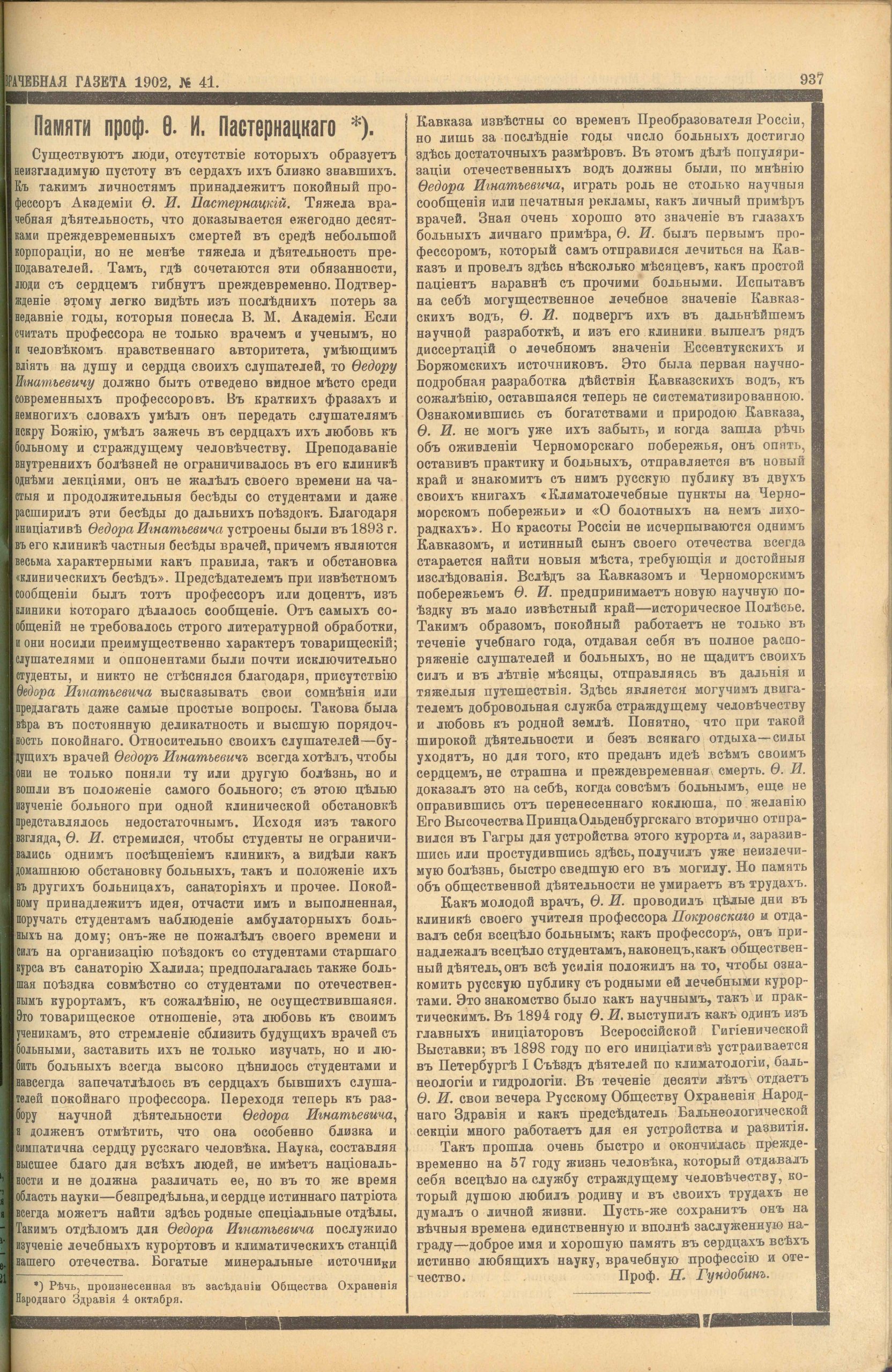 Некролог «Памяти проф. Ф. И. Пастернацкого», опубликованный в № 41 «Врачебной газеты» за 1902 г. Фонды Республиканской научной медицинской библиотеки.