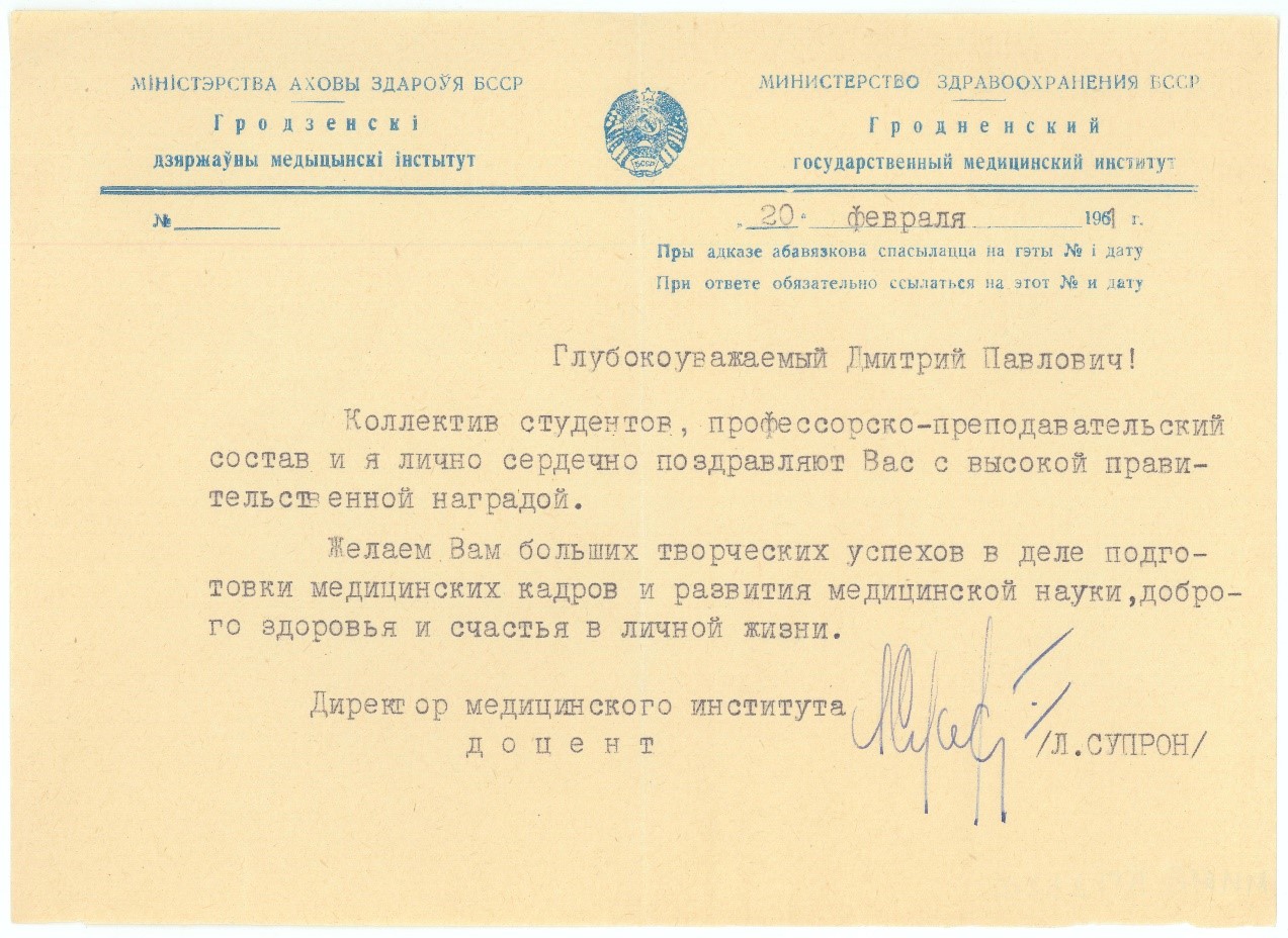 Официальное поздравление с высокой правительственной наградой. На имя Д. П. Беляцкого от коллектива студентов, профессорско-преподавательского состава и лично директора Гродненского государственного медицинского института Л. Ф. Супрона