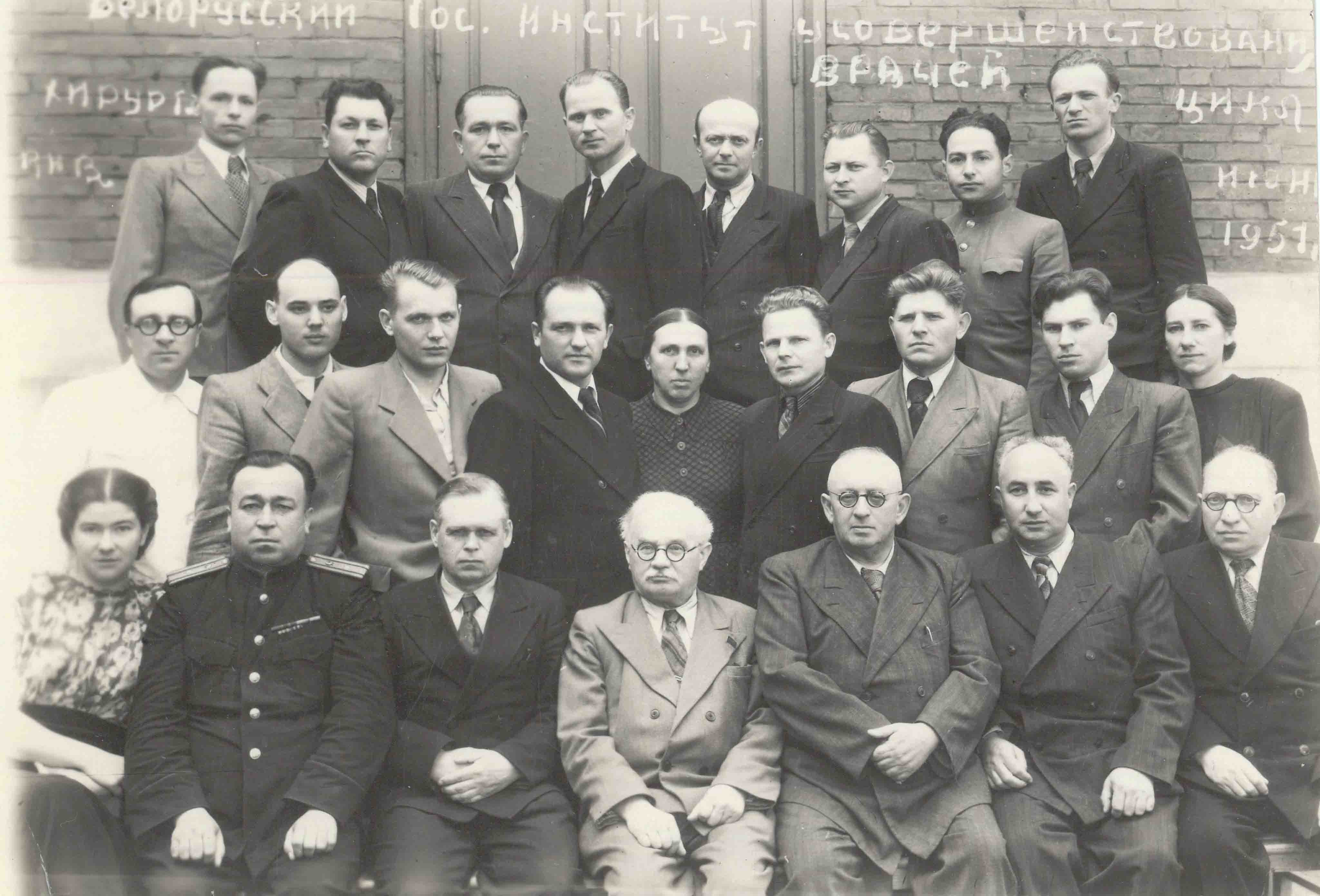 Группа врачей, обучающихся на цикле по хирургии в Белорусском государственном институте усовершенствования врачей. В 1-м ряду слева направо: 1-я – Красильникова, 2-й – ассистент П. П. Долголиков, 3-й – профессор А. М. Болдин, 4-й – директор института, профессор В. О. Морзон, 5-й – профессор Б. Н. Цыпкин, 6-й –доцент З. Х. Лившиц, 7-й – доцент З. Ш. Берман, 1951 г.